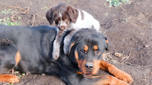Знакомство Ротвейлера Мираны с Дратхааром Лина. Ротвейлер в шоке от такой наглости😁