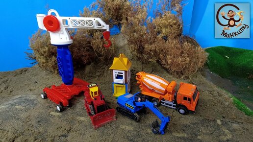 Машинки Игрушки - Экскаватор, бульдозер, бетономешалка и кран строят дом. Манкиту