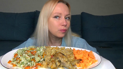Мукбанг Рис с курицей и овощами запеченные в духовке, Морквь с чесноком, вкуснятина. Салат витаминный с болгарским перцем и капустой. Еда,