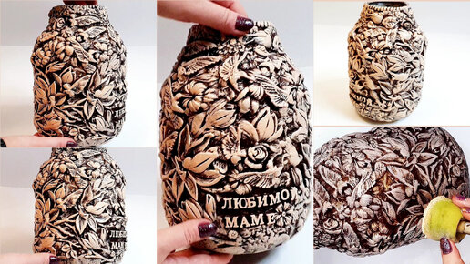 Цветочная ваза для мамы из подручных средств.Идея объемного декора своими руками. Ваза из стеклянной банки.Подробная видеоинструкция.