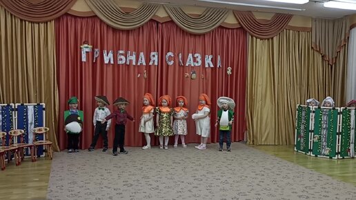 Наш первый спектакль в музыкально-театральной студии "Сказочный гном". Юлёна в роли лисички (гриб). Часть 1.