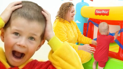 Ребенок прыгает на батуте радостная мама запрещает ходить на надувном батуте