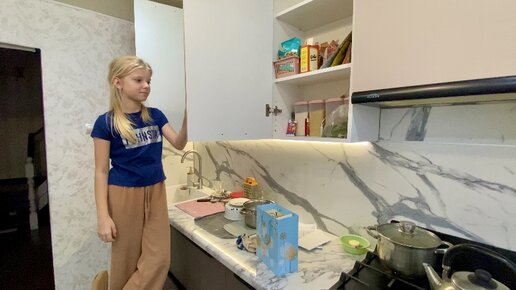 Уборка на кухне. Дочка наводит порядок на полках. Новые соседи.