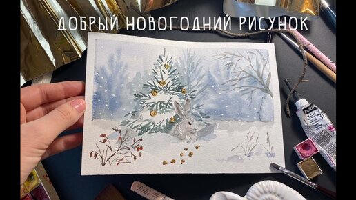 Милый новогодний рисунок с зайчиком. Рисуем открытку