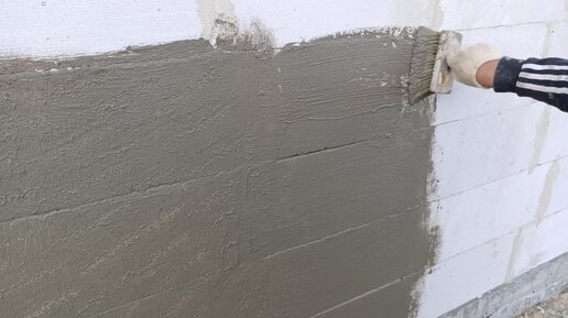 Адгезионный обрызг по газобетонному блоку, подготовка фасада к нанесению известково-цементной штукатурки Baumit MPA35 по маячкам