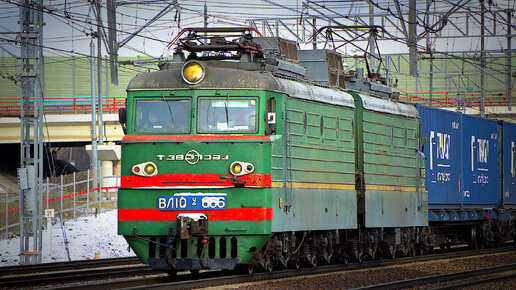 Зелёный ВЛ10У-666 с грузовым составом следует на участке Сколково – Баковка.