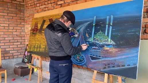 Работа на 2 холстах,Аргунская мечеть имени Аймани Кадыровой и Алые паруса Питер.. Зилавди Яшуркаев.