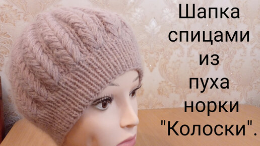 Шапка спицами из пуха норки "Колоски". Вяжем очень красивую и теплую шапки спицами.