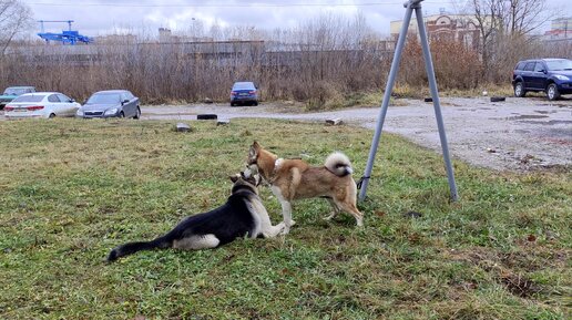 Пес Дарик и маленькая рыжуля. Поиграть бы, да короток повод