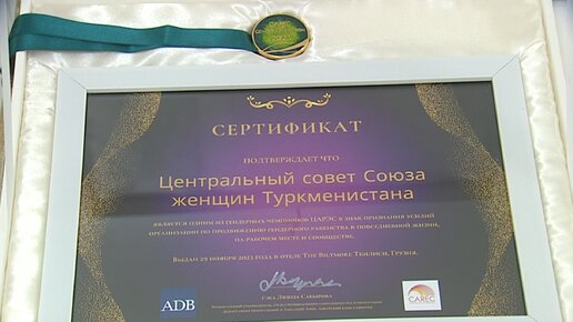Туркменистан получил награду и сертификат ЦАРЕС за продвижение гендерного равенства