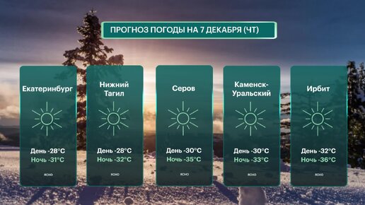 Погода 7 Декабря Четверг в Екатеринбурге, Нижнем Тагиле, Серове, Каменске-Уральском, Ирбите