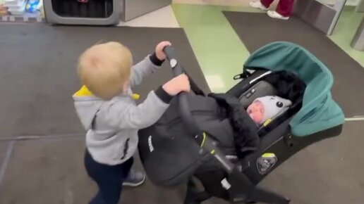 Гришка катит Николашку из роддома домой