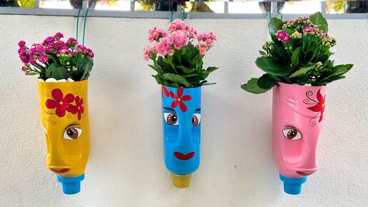Красиво и легко, утилизация пластиковых бутылок в горшки для цветов, полные искусства и цветов.