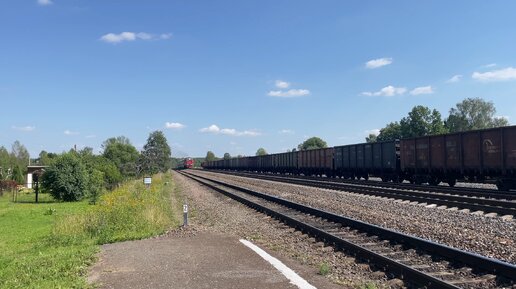 Станция Чёбакова. Пассажирский Кострома - Санкт-Петербург и грузовой поезда. Тепловозы ТЭП70БС и 2ТЭ116
