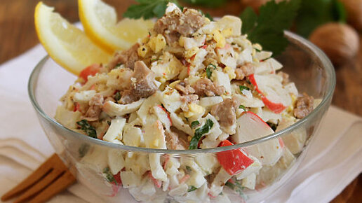 Прекрасно впишется в новогоднее меню. Салат из крабовых палочек и печени трески