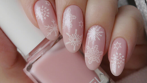 Нежный зимний маникюр со снежинками, стемпинг дизайн (обычный лак)