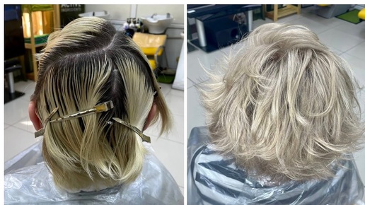 Холодный бежевый блондин с глубоким, затемненным корнем. Обесцвечивание отросших темных корней у блондинки Тонирование после обесцвечивания
