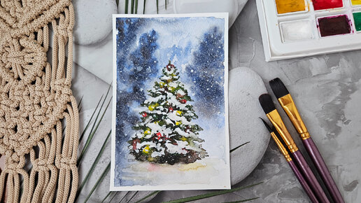 Новогодняя ёлочка акварелью 🎄 / открытка акварелью