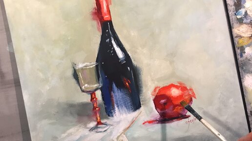 Как нарисовать натюрморт. Вино и яблоко. Живопись маслом. Плоские кисти и мастихин.