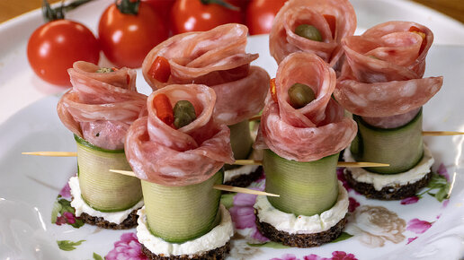 Закуска на новогодний стол. Розочки из колбасы и огурца