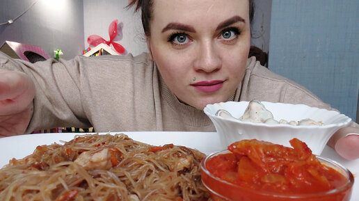 Мукбанг фунчоза с овощами, кимчи, мидии в горчичном соусе