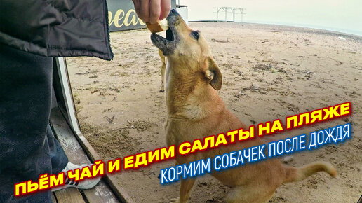 Пьём чай и едим салаты на пляже. Кормим собачек после дождя.