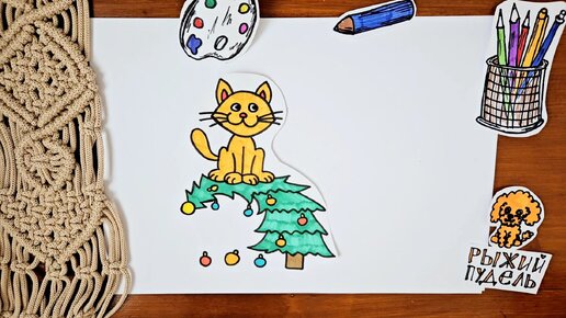 Как нарисовать котёнка 🐈 на ёлке🎄 / Поэтапный рисунок для детей 7, 8, 9, 10 лет