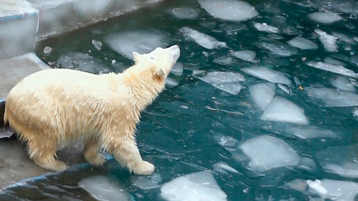 Медвежата бесстрашно плавают в ледяной воде, раздвигая льдины. 01.12.2023г.