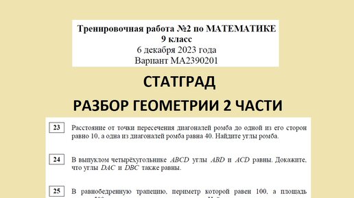 СтатГрад. Тренировочная работа № 2 по математике (ОГЭ) от 6 декабря 2023 года. МА2390201. Вся геометрия 2 части.