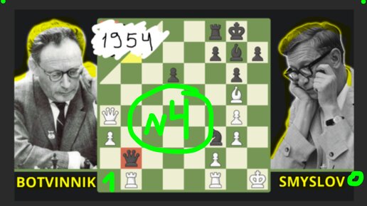 И снова победа Ботвинника за белый цвет в партии №4 матча 1954 г. в Москве. Василий Смыслов нарвался на детскую ловушку и вскоре сдался, 1-0