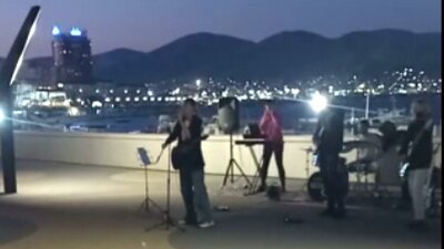 Девушка поет песни "Короля и шута" вечером на набережной Новороссийска.