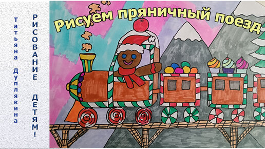 Рисуем чёрным маркером и цветными маркерами новогодний пряничный поезд