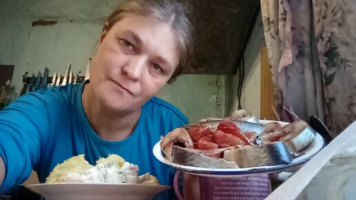 Мукбанг/ Картошка, салатики и рьбка.