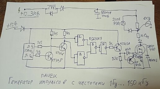 Генератор пачек импульсов для теслы и любой индуктивной нагрузки (f=1 Гц...150 кГц, d=0..99%). Схема