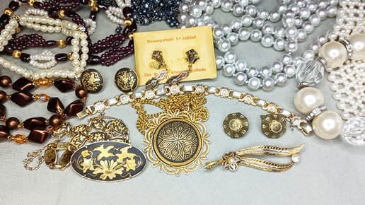 Распаковка лота с украшениями дамаскин и жемчужными украшениями