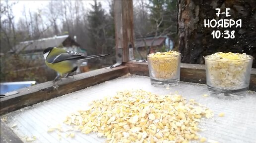 Обычный день кормушки. 7-е ноября 2023 г. Лазоревка, гаичка, большие синицы, воробьи, поползень