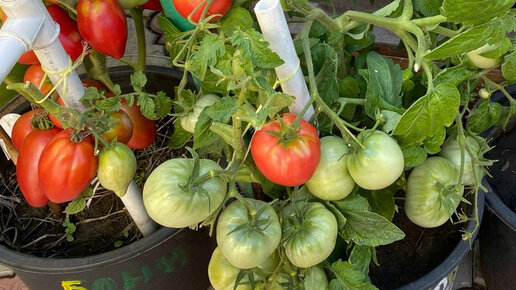 Урожай томатов в ведрах