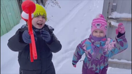 После снегопада Павел с детьми в саду. Спасают теплицы!