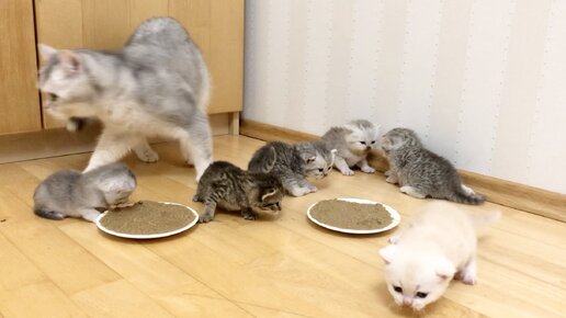 Первая попытка прикормить котят кошки Кайли быстро закончилась. Ела корм только одна девочка Сима, остальные котята дико орали.