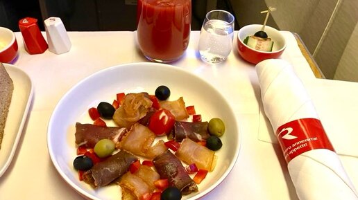 Обед на борту самолёта Боинг 777 а/к Россия рейс Москва-Магадан бизнес-класс (время в пути 7:40)