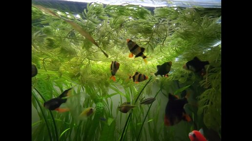 попугайчики и барбусы добивают раненую рыбку