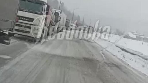 На участке трассы М-5 «Урал» из-за снегопада перекрыли дорогу, а фуры выстроились в километровые очереди