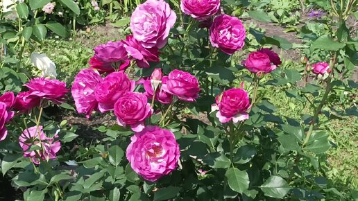Цветение роз Wild Blue Yonder, Rokoko, Bordure Magenta и Weisse Wolke. Июль 2023 г.
