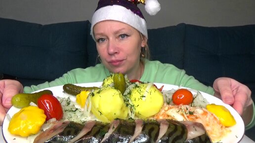 Мукбанг Скумбрия копченая, картофель отварной, капуста маринованная, соленья и лучок. Еда.