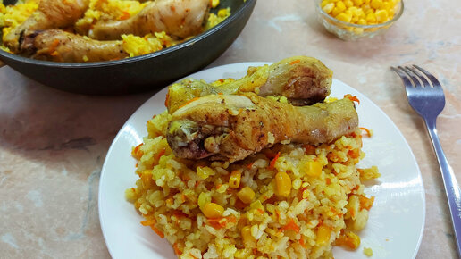 Куриные ножки с рисом на сковороде. Всё готовится на одной сковороде
