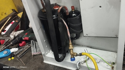 Впаивание нового компрессора системы Rittal и замена фильтра (под азотом).