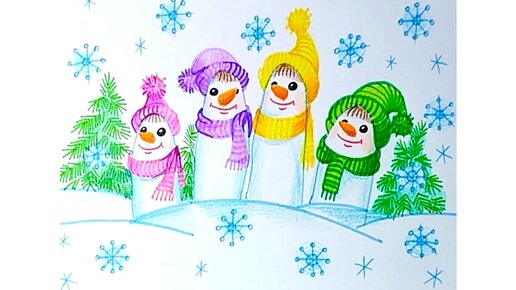 Снеговики в разноцветных шапках. Рисунок маркерами (фломастерами) и цветными карандашами.