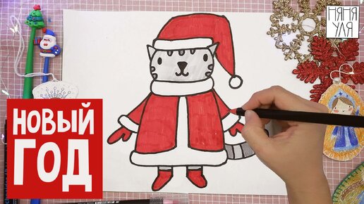 Рисуем Новогоднего КОТА поэтапно | Новогодние рисунки для срисовки | Уроки рисования