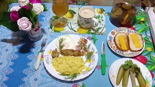 Картофель, кебаб, яичница, огурчик, тосты с сыром, кофе, чай