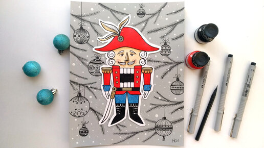 Как нарисовать щелкунчика. Стильная зимняя иллюстрация с элементами аппликации